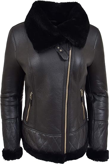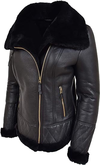 Women’s Genuine Double Face Black Sheepskin Shearling Aviator Jacket